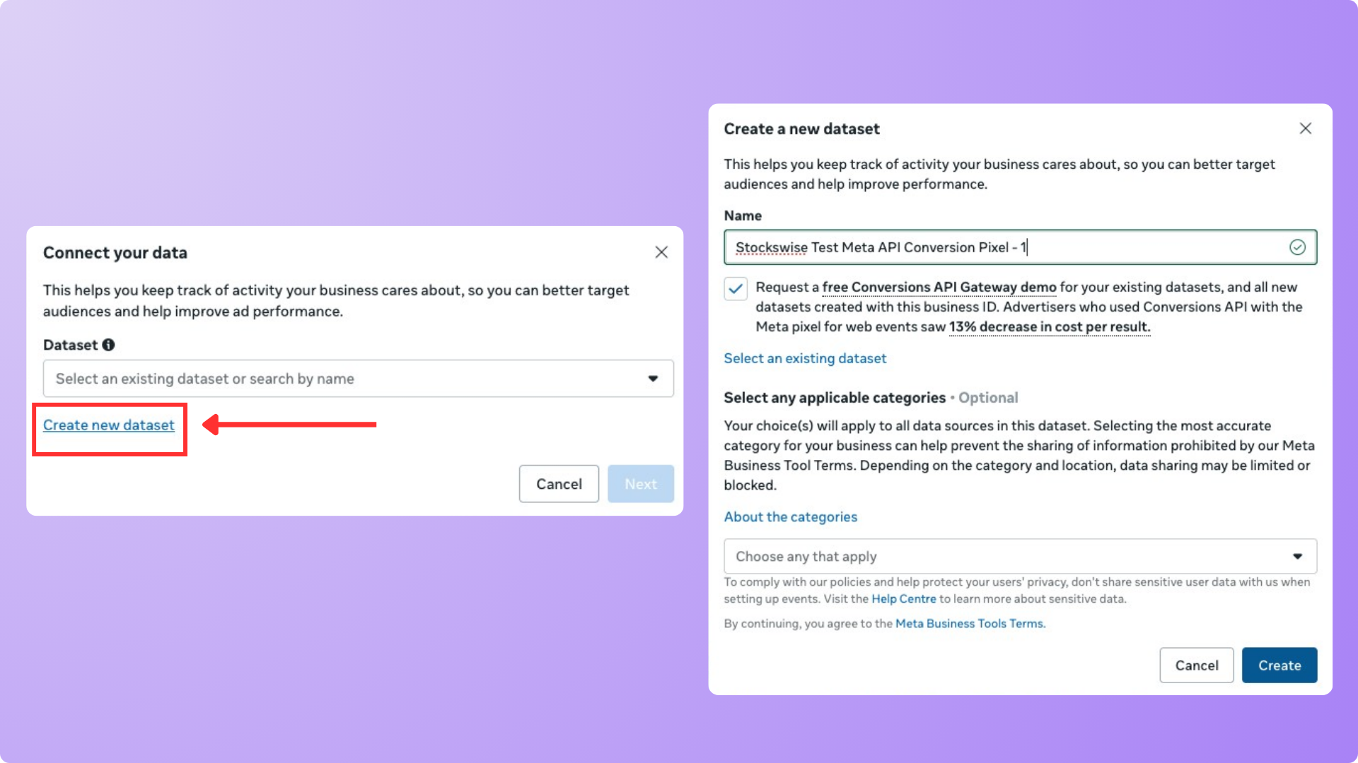 On the next screen, add a name under create a new dataset. Plus ensure to select Request a free conversion API gateway and click and create.