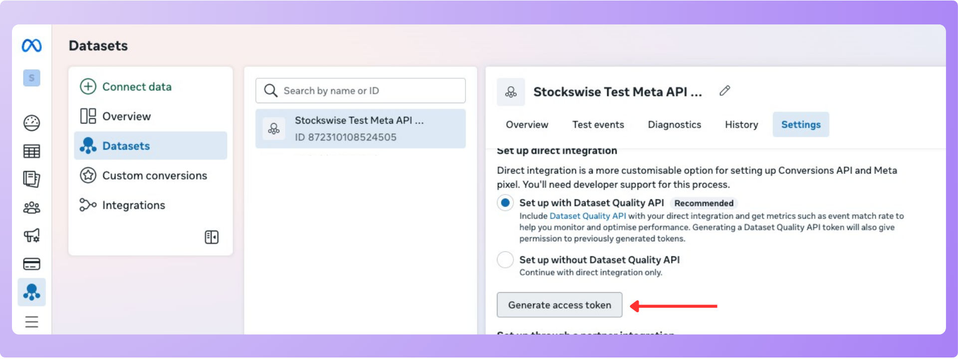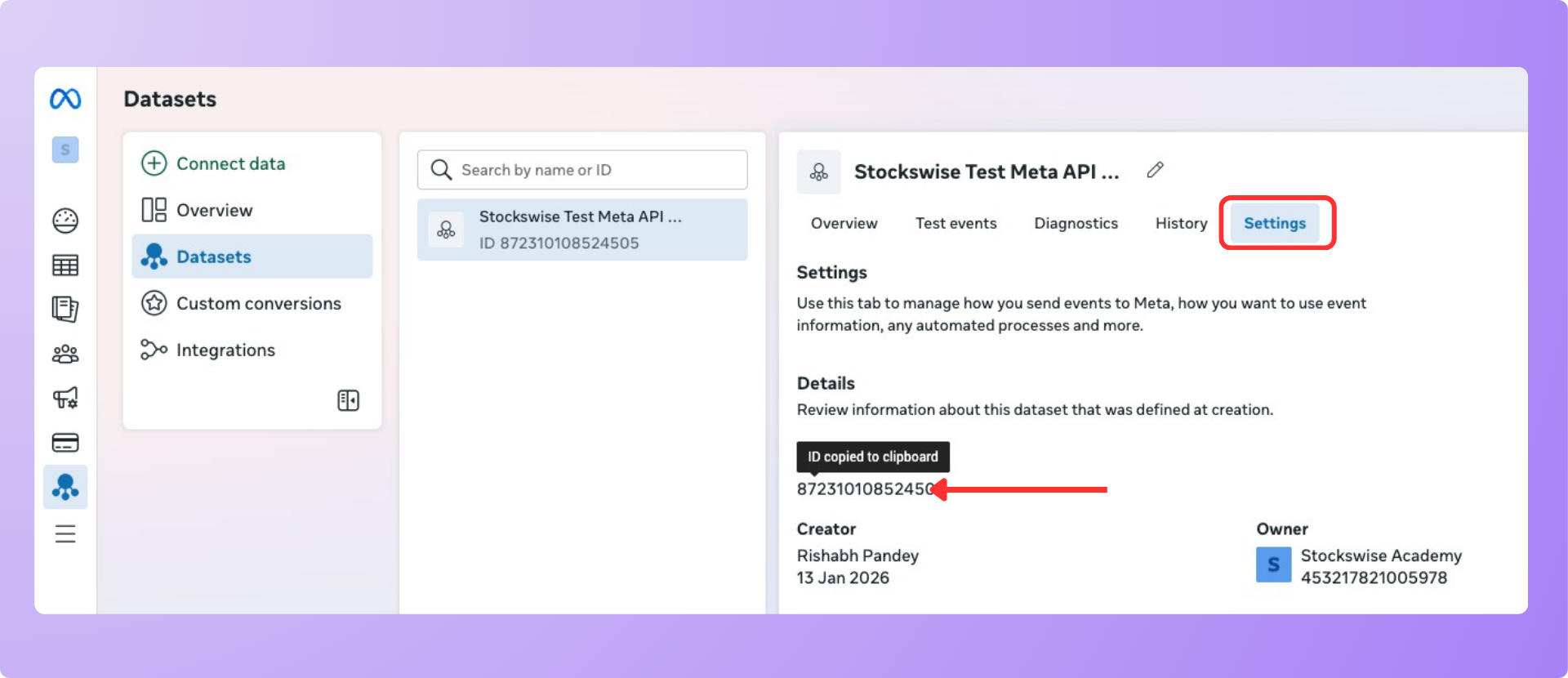 Here's how to access the Conversion API ID and Access token that you would need to save on the Knorish dashboard. To complete this open the 'Settings' tab and click on the number under dataset ID. Save this in a notepad as this will be required on the Knorish dashboard. This is also known as Facebook or Meta Pixel code.