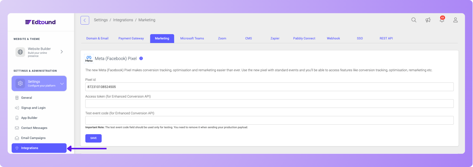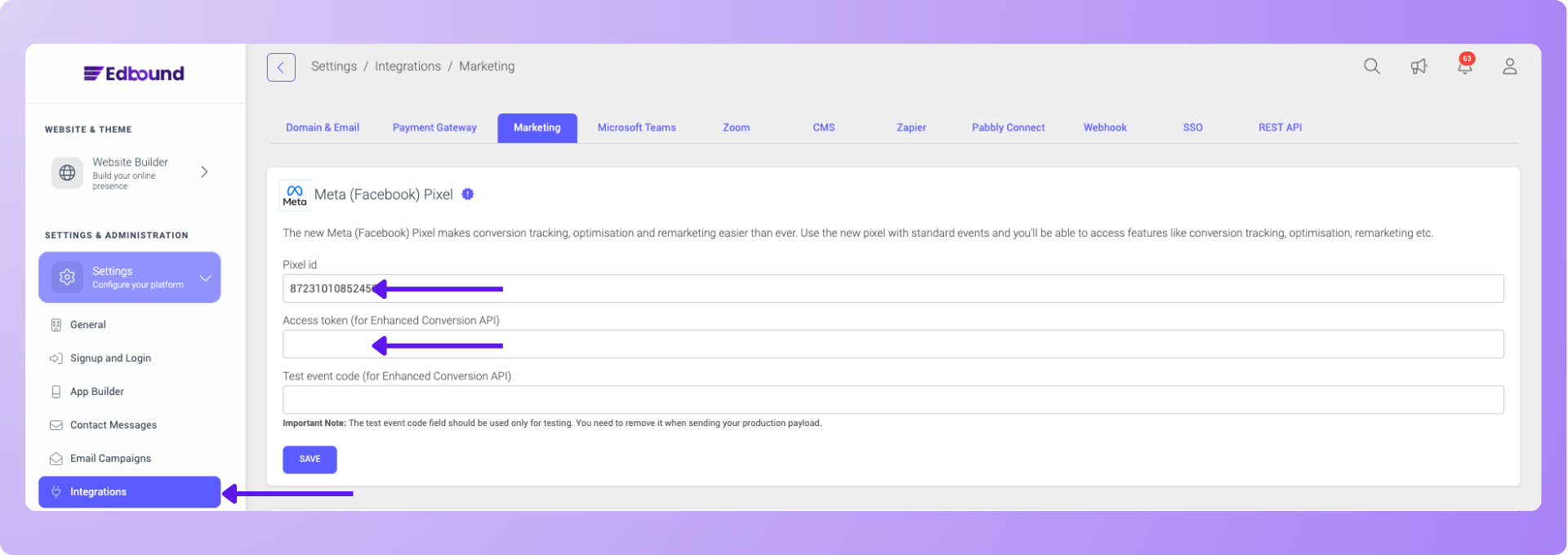 Open the Knorish dashboard Settings> Integrations> Marketing tab and paste the Conversion API Pixel ID and the generated Access Token in Meta Pixel. Click Save.