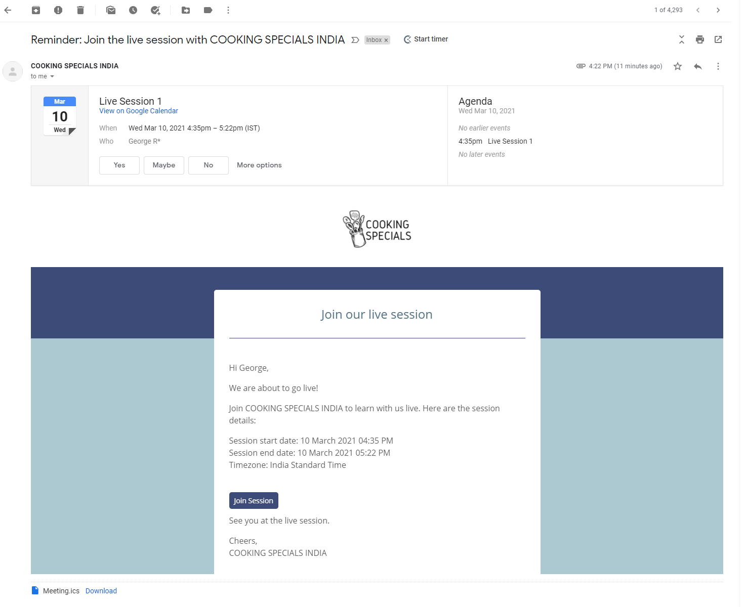 Students will receive an automatic email reminder 1 hour before the session stating that the session is about to start and it will also have the join session button which will redirect users to the site/course where they need to click on the Join now button again.