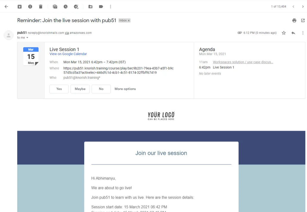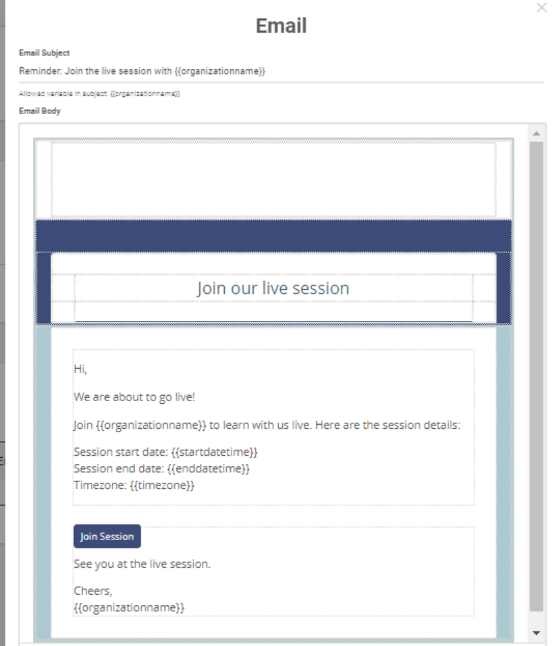 IMP: When the option is selected, the live sessions created on the platform send an email reminder to the learner to join the session. This reminder email when enabled is sent 1 hour prior to the session. Should you need you can add more email reminders.