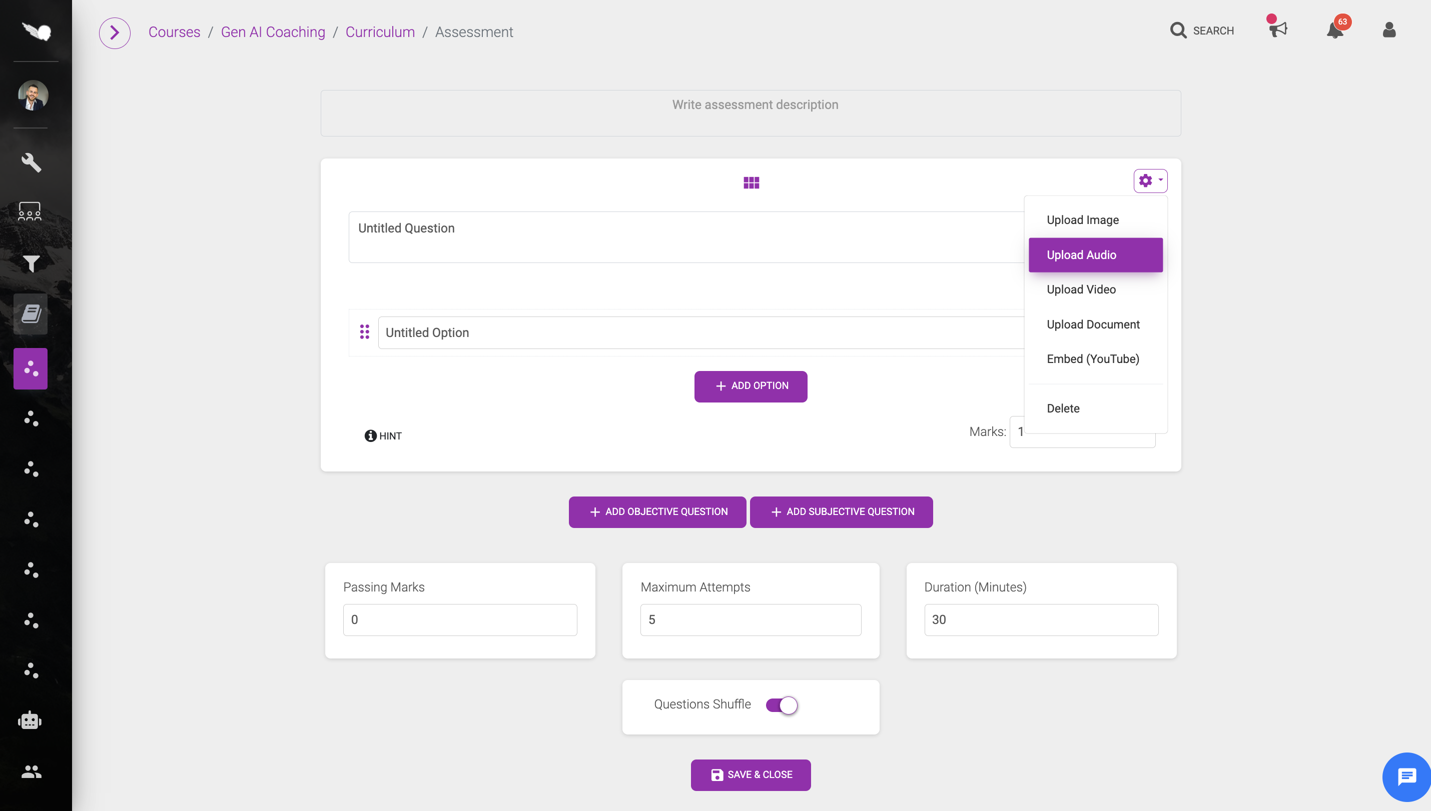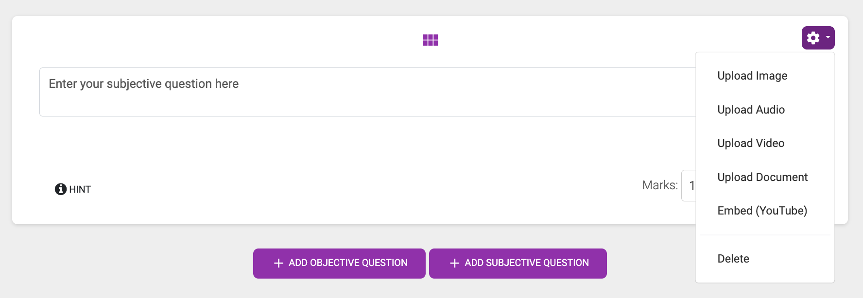 You can create both subjective and objective questions as part of the assessment. Objective questions can be single or multiple choice. You can now upload images, audio, video, or documents in both the question and answer options for added context. You can also embed YouTube videos directly.