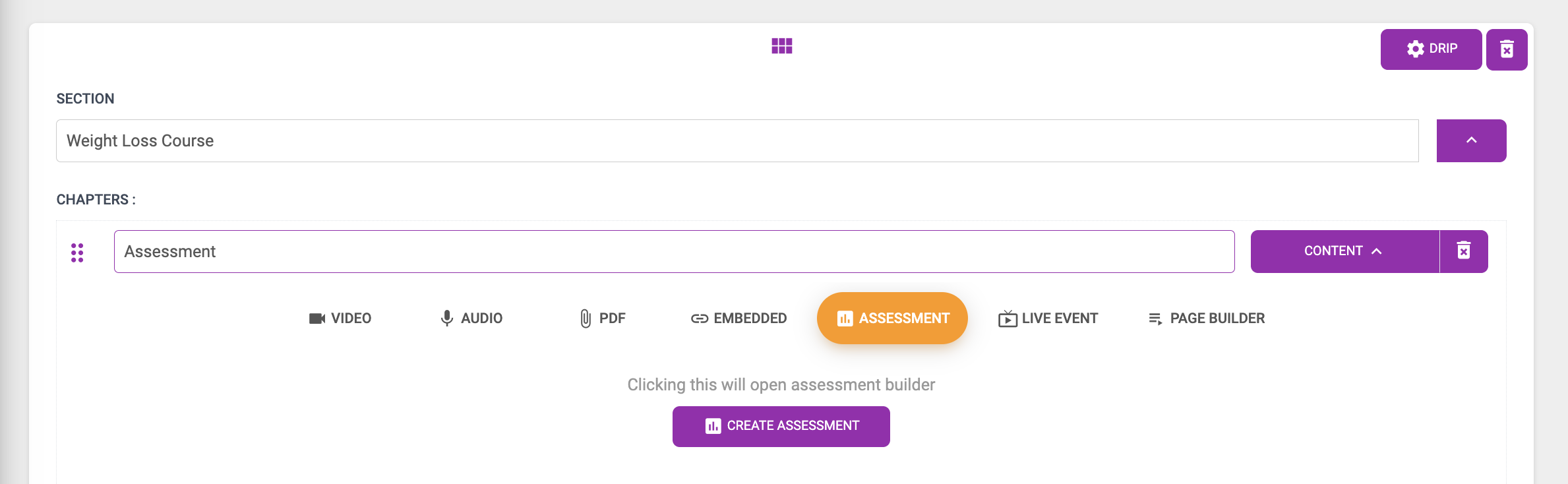 Assessment builder: Takes you to the course curriculum section where you can add more sections, chapters, content like PDFs, docs, videos, and create or edit assessments.