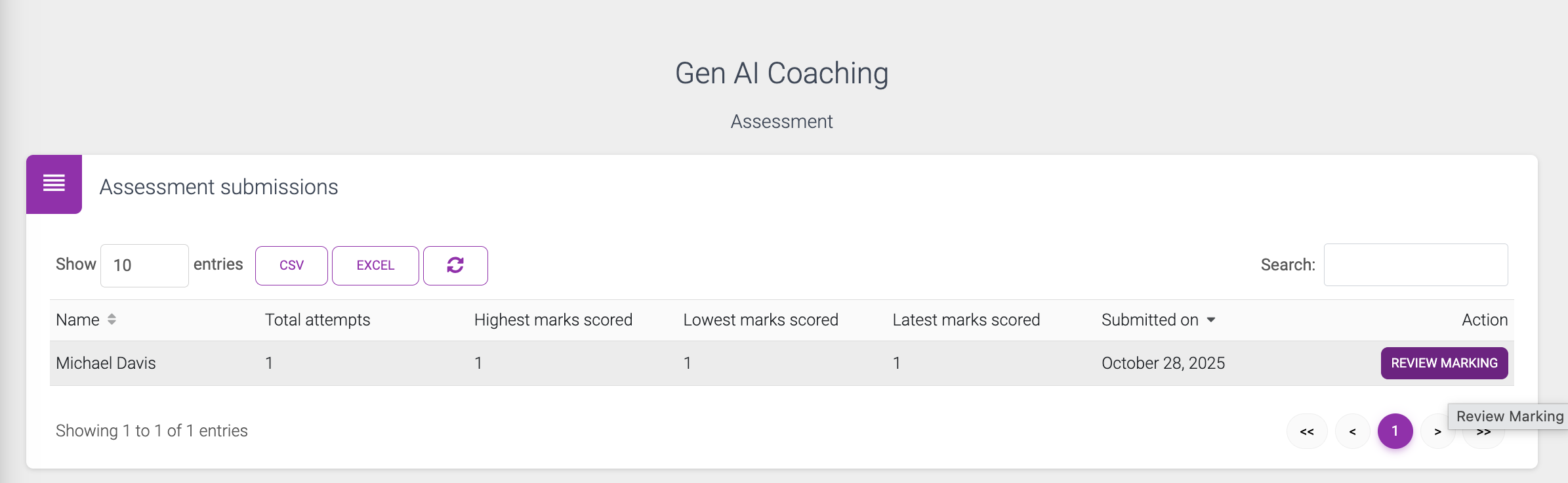 Assessment submissions: To review all submissions' status, check if any assessments are yet to reviewed or are unmarked and mark them.