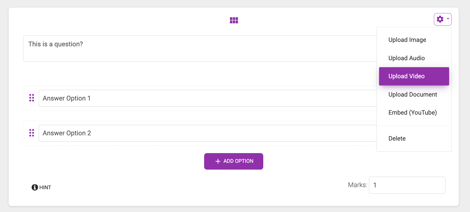 Use the settings (gear icon) next to each question or option to upload Image, Audio, Video, Document, or embed a YouTube video