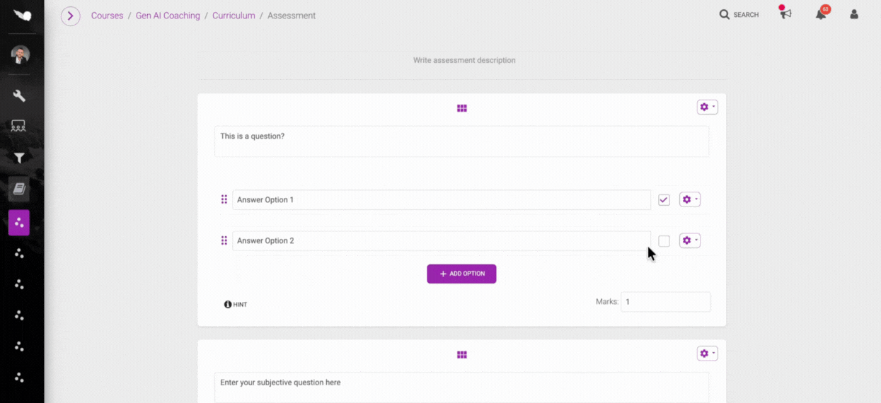 Subjective questions allow learners to submit detailed written answers, reviewed later by the course publisher. You can now attach images, audio, video, or documents in the question for better context. Here's how to add subjective questions to your assessments: