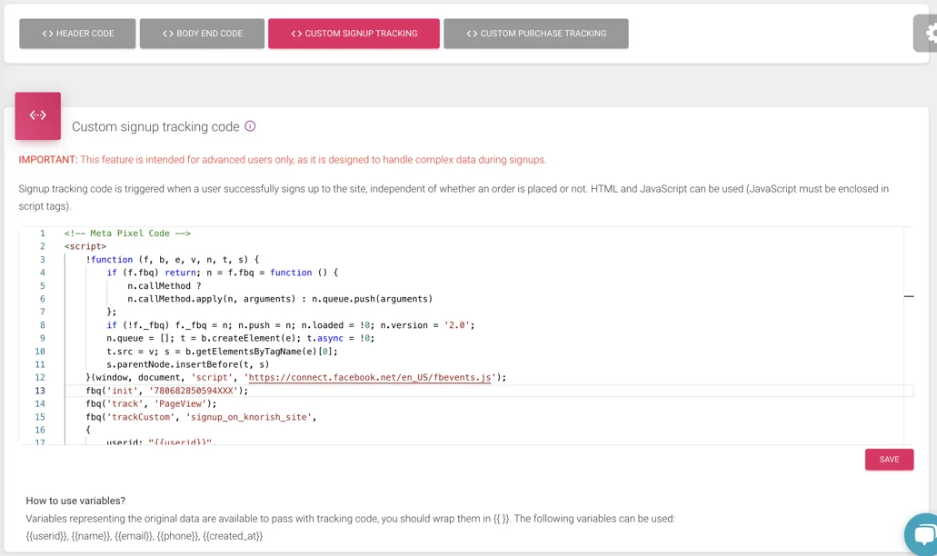 Here is a sample code that you can use for tracking signups. Make sure to replace all placeholders within curly braces so that they are sent to Facebook Pixel along with the event data. It's important to note that in the following tracking code, we are creating a custom event named "signup_on_knorish_site".