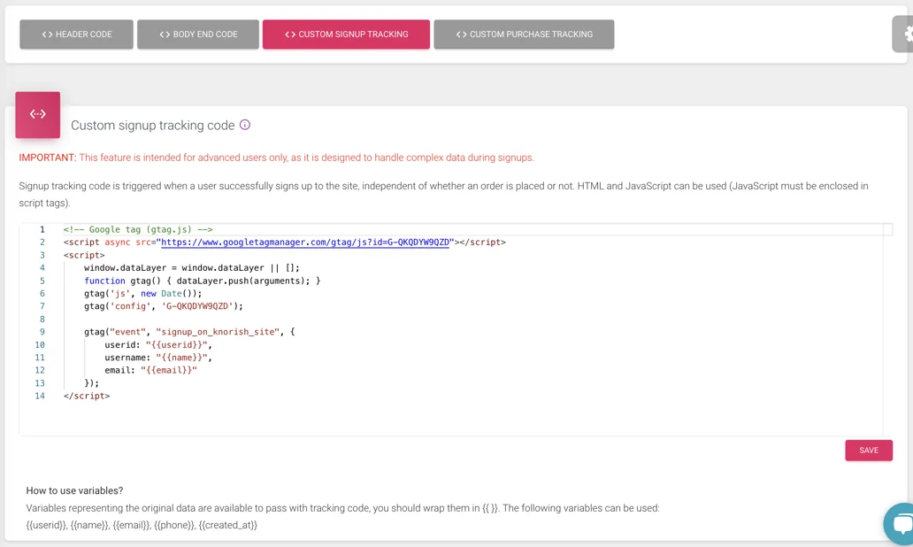 Here is a sample code that you can use for tracking signups. Make sure to replace all placeholders within curly braces so that they are sent to Google Analytics along with the event data. It's important to note that in the following tracking code, we are creating a custom event named "signup_on_knorish_site".