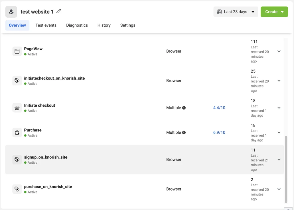 Once you add the tracking code, the events along with their data will begin appearing on the Facebook Pixel dashboard. It may take upto 30 mins to display data on FacebookPixel dashboard.